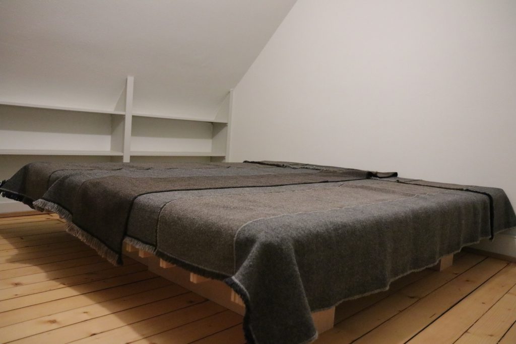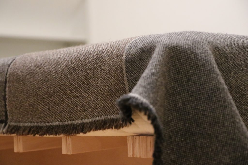 Der schwere Bettüberwurf aus Sarntaler Schafschurwolle ist in einer Leinenbindung (4/1) gewebt. Seine Schwere lässt ihn schön aufliegen. Schuss und Zettel sind mehrfarbig, was einen leicht changierenden Effekt ergibt.